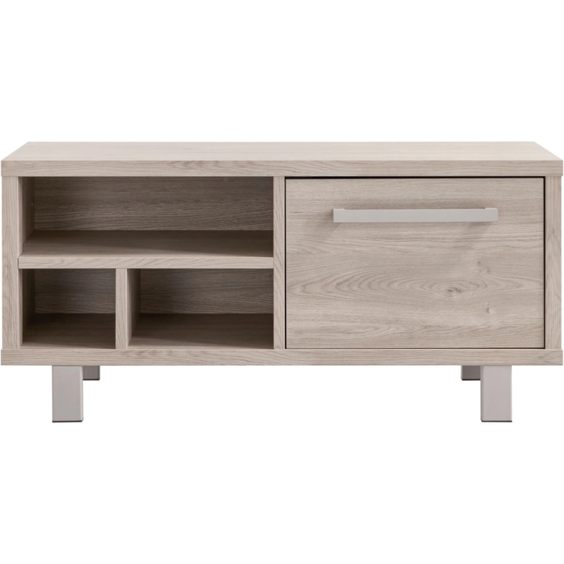 Uitgevoerd in de kleur grey oak met metalen handgrepen en poten in de kleur stone grey, met 1 deur en 3 open vakken.