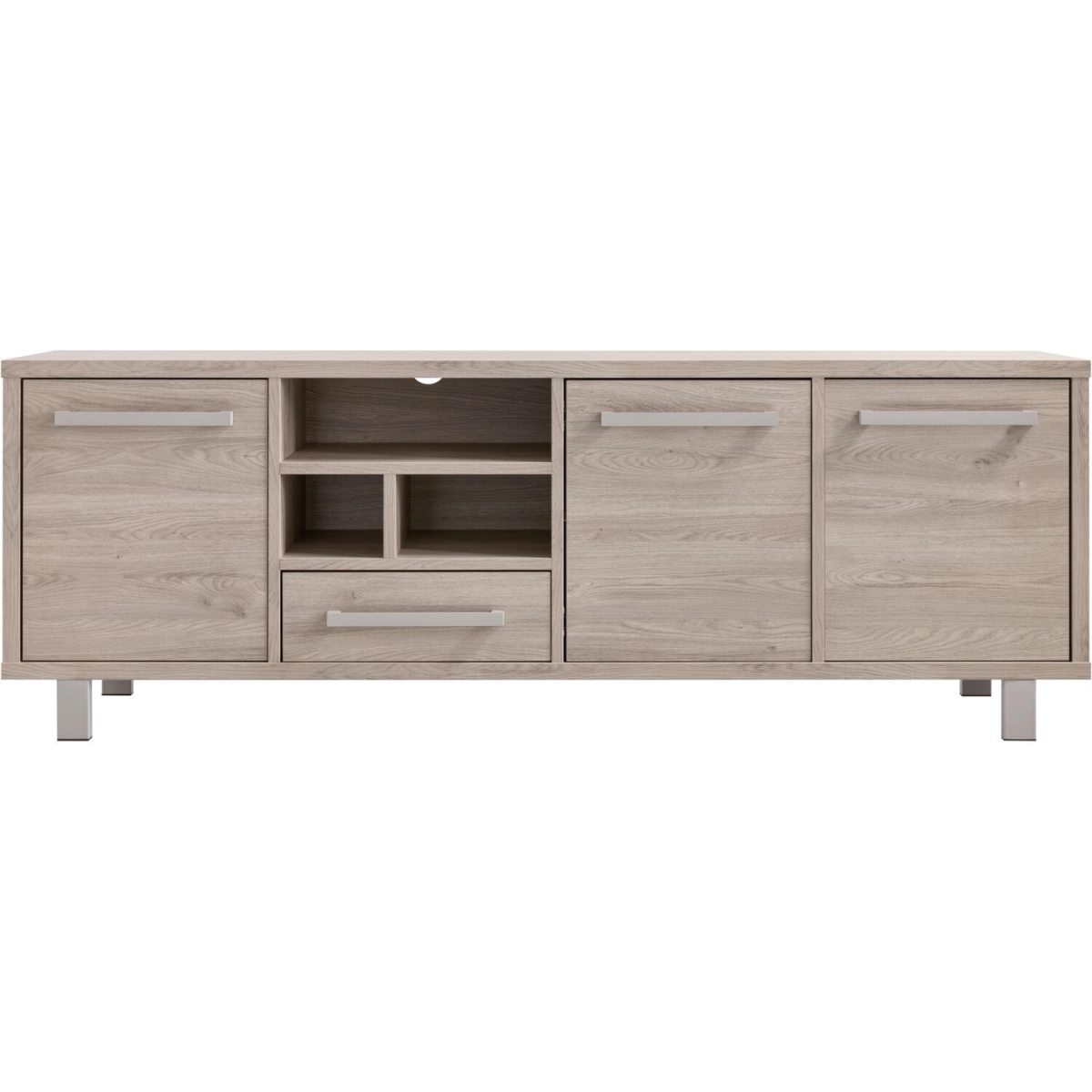 Uitgevoerd in de kleur grey oak met metalen handgrepen en poten in de kleur stone grey, met 3 deuren, 1 lade en 3 open vakken.