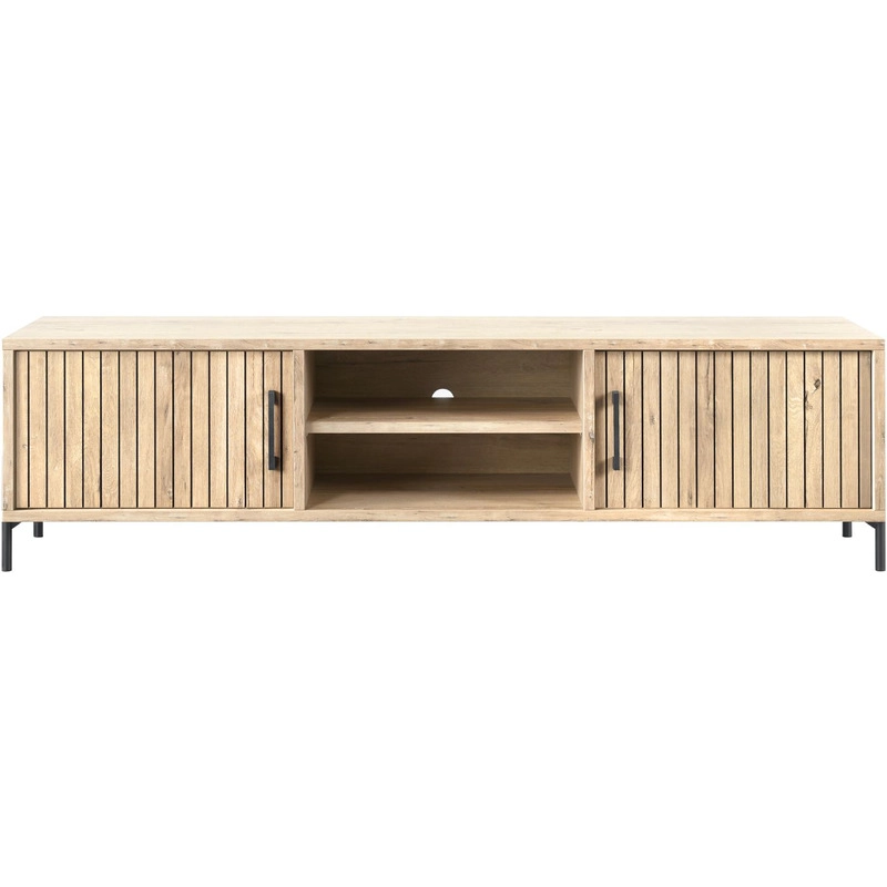 Stijlvol TV-meubel 214 cm met 2 deuren en 2 open vakken Kras-, slijt-, en stootvast met de uitstraling van echt houtDeuren met softcloseOnderdeel van een meubelserieZelf te monterenMet dit TV-meubel Mena haal je een echte eyecatcher in huis. De handgrepen en de poten zijn van mat zwart metaal, wat een mooi contrast geeft met de lichte houtkleur.Het meubel is afgewerkt met een melamine toplaag. Melamine heeft de uitstraling van echt hout, maar het is een kras-, slijt-, en stootvast materiaal wat erg gebruiksvriendelijk en makkelijk te onderhouden is.Het TV-meubel Mena heeft 2 deuren en 2 open vakken. De deuren zijn voorzien van softclose, waardoor deze automatisch zachtjes dichtvallen. In het TV-meubel kun je je apparaten en spullen overzichtelijk opbergen en ordenen. Het TV-Meubel is voorzien van een opening aan de achterzijde voor het doorvoeren van de kabels. Het meubel wordt ongemonteerd geleverd, maar is met behulp van een montagehandleiding eenvoudig in elkaar te zetten.Is dit TV-meubel iets te groot voor jouw woonkamer? Geen probleem, het is tevens verkrijgbaar in een kleinere variant van 138 cm breed. Online vind je nog een aantal andere meubelen uit de meubelserie Mena, zoals een dressoir en een smalle kast. In de winkel vind je alle andere verkrijgbare items uit deze serie.OnderhoudsadviesHet onderhoud van dit meubel is heel eenvoudig. Voor het gewone onderhoud volstaat afnemen met een licht vochtige doek, droog het meubel daarna direct na met een schone en droge doek. Bij onvoldoende resultaat of hardnekkige vlekken kun je voor deze meubelserie de Multi Cleaner gebruiken.