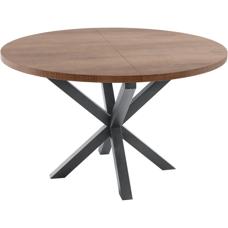 Ronde donkerbruine uitschuiftafel Caltana Ø130(+40) cm Uitstraling van massief hout Geschikt voor 4 tot 6 personen Onderdeel van een tafelserie Zelfmontage Deze eettafel heeft een mooie uitstraling door de combinatie van een zwart metalen spinpoot met melamine in een mooie donkerbruine kleur. Melamine lijkt op echt hout, het is makkelijk in onderhoud en erg krasbestendig. Een erg gebruiksvriendelijke tafel dus!De tafel is Ø130 cm en heeft de uitstraling van massief hout. Omdat het een uitschuiftafel is, loopt er een naad in het midden van het tafelblad, waar je de twee bladen uit elkaar kunt schuiven. Afhankelijk van de stoel die je aan de tafel zet, passen er 4 tot 5 personen rond de tafel met de standaard afmeting van Ø130 cm. Maak je gebruik van het tussenblad en verleng je de tafel met 40 cm, dan passen er zeker 6 personen aan de tafel. Handig! Zeker als je standaard niet genoeg ruimte hebt voor een grotere tafel in huis, maar wel vaak met meerdere mensen aan tafel zit. De twee bladen zijn gemakkelijk uit elkaar te schuiven, waarna je het tussenblad er gemakkelijk tussenin plaatst.De hoogte tot de onderkant van het tafelblad is ongeveer 75 cm. Handig om te weten voor als er armstoelen onder komen te staan. Het frame is eenvoudig te monteren middels de bijgeleverde handleiding. Daarnaast is de tafel goed te combineren met de meubels uit woonserie Tenino, en is deze tevens verkrijgbaar in andere maten én andere vormen.OnderhoudsadviesHet onderhoud van deze kast is heel eenvoudig. Voor het gewone onderhoud volstaat afnemen met een licht vochtige doek, droog het meubel daarna direct na met een schone en droge doek. Bij onvoldoende resultaat of hardnekkige vlekken kun je voor deze meubelserie de Multi Cleaner gebruiken.