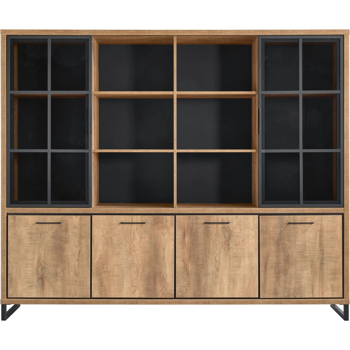 Uitgevoerd in melamine mango decor met zwart metalen frame met 4 deuren, 2 glazen deuren en 6 open vakken.