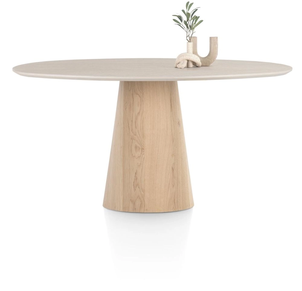 Eetkamertafel ARAS is met zijn ovalen blad en centrale conische poot een eyecatcher voor je interieur. Het blad heeft een afmeting van 150 x 120 cm en is gemaakt van Primo Laminato (HPL) in travertinlook. Het onderstel van ARAS is uitgevoerd in gelakt eikenfineer. De consche poot is aan de binnenzijde verzwaard om maximale stabilteit van de tafel te garanderen. Wil je de rechte lijnen in je interieur doorbreken en je interieur meer zachtheid geven? Dan is ARAS jóuw eetkamertafel!