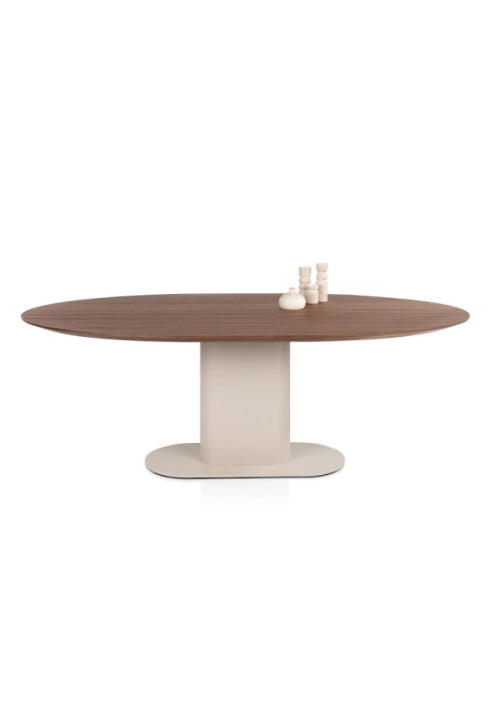 Ontdek de elegante uitstraling van eetkamertafel BRIANZA. Het ovalen blad is uitgevoerd in warm walnootfineer en heeft een verjongde rand, wat de tafel een luchtige look geeft. De ronde vormen en subtiele metalen details versterken het eigentijdse karakter. De stevige ellipsvormige kolompoot is in crèmekleur uitgevoerd en verzwaard voor optimale stabiliteit. Zo geniet je niet alleen van stijl, maar ook van functionaliteit. Liever een donkerder accent? Deze tafel is ook verkrijgbaar met een poot in steelbrown. Combineer hem met de andere tafels en kasten uit de BRIANZA collectie en haal een luxe, eigentijdse sfeer in huis.