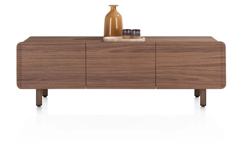 Dit BRIANZA lowboard is een stijlvolle oplossing voor wie een compact, modern tv- of hifimeubel zoekt. Het meubel heeft drie greeploze deuren met softclose systeem en is afgewerkt in gelakt notenfineer. De zichtbare nerfstructuur loopt als één vloeiend geheel door over de volledige breedte, wat het lowboard een luxe uitstraling geeft. De afgeronde hoeken van de ombouw en het bovenblad sluiten naadloos aan op de afgeronde poten in notenfineer. Extra bijzonder zijn de fronten met hun subtiele opstaande rand die samen één elegante lijst vormen. Plaats BRIANZA staand of kies voor wandmontage en creëer een luchtig, zwevend effect in je interieur.