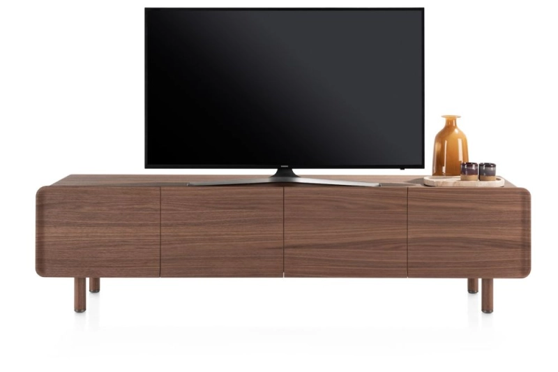 Dit BRIANZA lowboard is een modern en stijlvol meubel dat perfect dient als tv- of hifimeubel. Met zijn vier greeploze deuren en softclose systeem combineert dit lowboard gebruiksgemak met een strakke uitstraling. Het meubel is afgewerkt in gelakt notenfineer, waarbij de zichtbare nerfstructuur als één vloeiende lijn over de volledige breedte doorloopt. Uniek detail: de fronten hebben een subtiele opstaande rand die samen een elegante, afgeronde lijst vormen. Dankzij de afgeronde hoeken en de doorlopende notenhouten poten oogt het lowboard verfijnd en harmonieus. Je kunt BRIANZA zowel staand als zwevend aan de wand plaatsen, voor een ruimtelijk en luchtig effect.