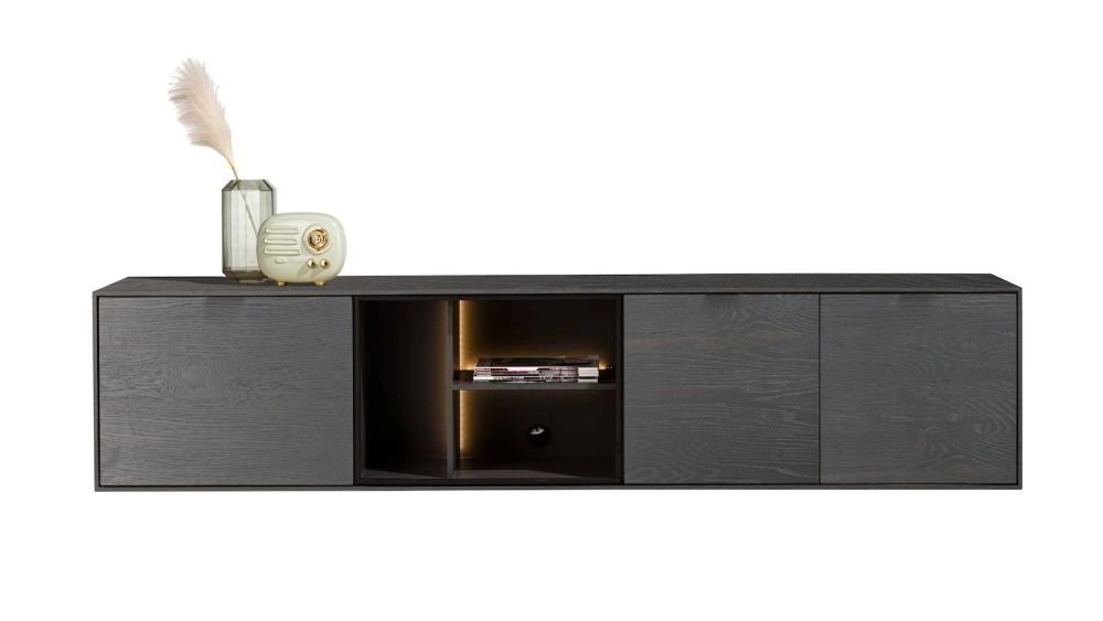 Elements, lowboard 210 cm. - hang + 2-deuren + klep + 3-niches + led - Onyx