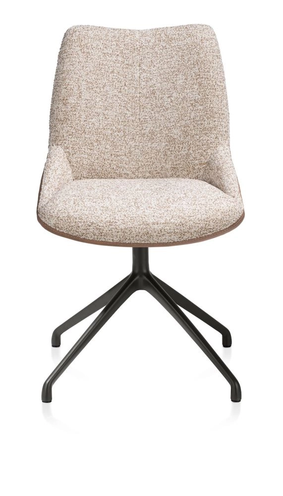 Deze MATS armstoel heeft een kruispoot in gegoten aluminium in de kleur off-black. Het is een draaipoot waardoor de stoel 360 graden draaibaar is. Het draaisysteem maakt het makkelijk om aan tafel te gaan zitten zonder te schuiven met de stoel. De zitting is uitgevoerd in een combinatie van microvezelstof Pala in de kleur cognac en de stof Luton in de warme kleur koper. De materialen voelen zacht aan en geven de stoel een stijlvolle uitstraling.
