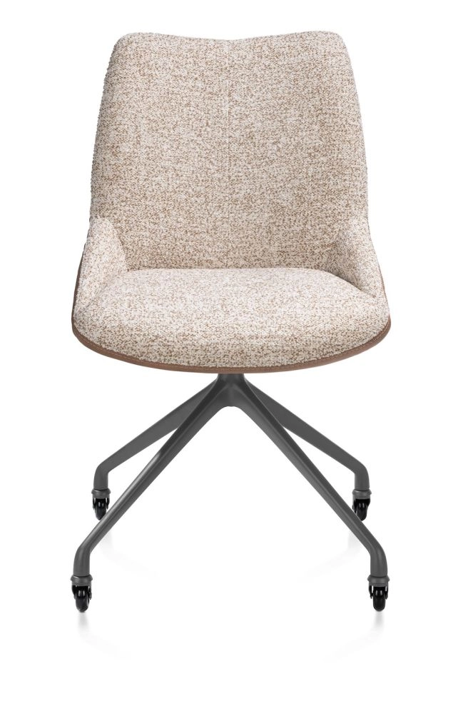 Deze MATS armstoel is uitgevoerd met een kruispoot op wielen in gegoten aluminium op wielen in de kleur grafiet. Dit maakt het aanschuiven aan tafel praktisch en soepel. De zitting heeft een kleurcombinatie van microvezelstof Pala in de kleur cognac en de stof Luton in de warme kleur koper. De combinatie van materialen zorgt voor een elegante en warme uitstraling.