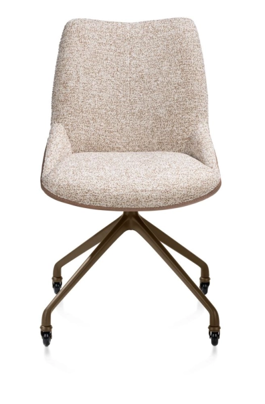 Deze armstoel MATS heeft een kruispoot op wielen, uitgevoerd in gegoten aluminium in de kleur steelbrown. Hierdoor verplaats je de stoel eenvoudig en neem je comfortabel plaats aan tafel. De zitting is uitgevoerd in een kleurcombinatie van microvezelstof Pala in de kleur cognac en de stof Luton in de warme kleur koper. De zachte materialen geven de stoel een stijlvolle uitstraling.