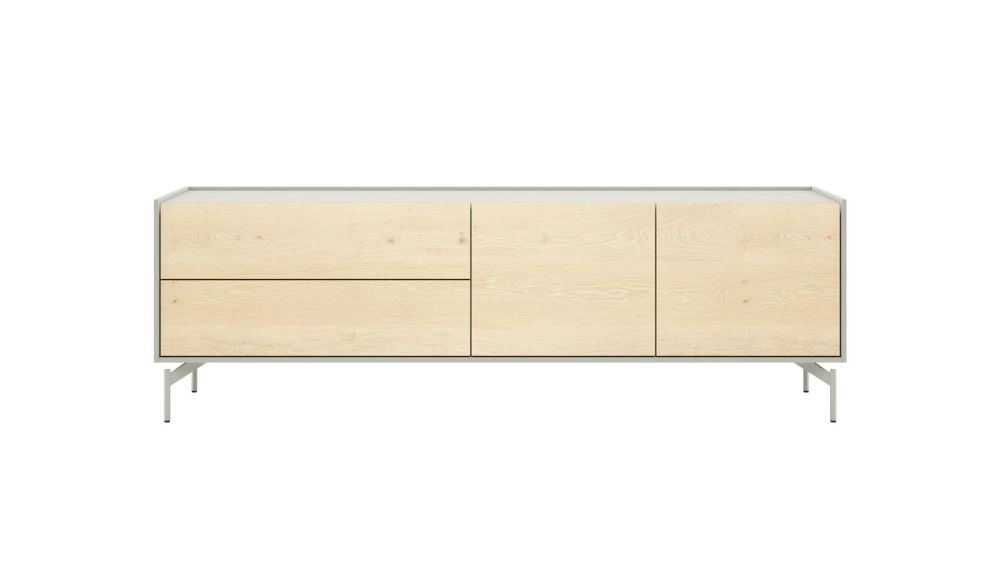 NIORA is een eigentijds lowboard van 170 cm met een natuurlijke uitstraling en een minimalistisch design. Het softclose-systeem zorgt ervoor dat de 2 deuren en 2 laden zachtjes sluiten. Het lowboard is gemaakt van gelakt MDF, terwijl de deuren van eikenfineer zijn. De grepen zijn geïntegreerd in de houten fronten, wat zorgt voor een strakke look. Lowboard NIORA geeft een ruimtelijk effect aan je woonkamer; het kan namelijk aan de wand worden bevestigd waardoor het lijkt te zweven. Deze eyecatcher is ook verkrijgbaar als dressoir, dressette of bergkast.