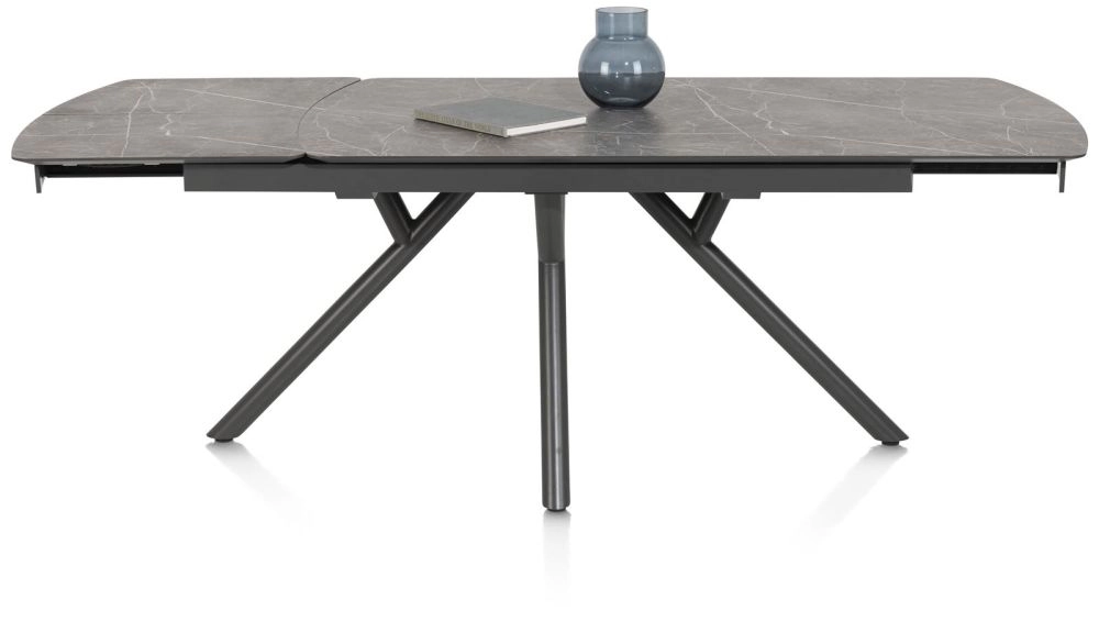 Wil jij altijd genoeg plek hebben aan tafel? Uitschuiftafel NOVELLO is 170 cm lang en met 60 cm te verlengen. De tafel staat bekend om zijn luxe uitschuifsysteem: bij het uitschuiven van de tafel schuift het hele blad mee, zowel links als rechts. Het onderstel blijft daardoor altijd centraal onder het tafelblad staan. Het prachtige marmerlook blad van NOVELLO is gemaakt van Primo Laminato (HPL) en verkrijgbaar in de kleuren lichtgrijs en onyx. Het blad is ook verkrijgbaar in naturelkleur eikenfineer. Deze moderne uitschuiftafel staat op een metalen onderstel in de kleur grafiet.
