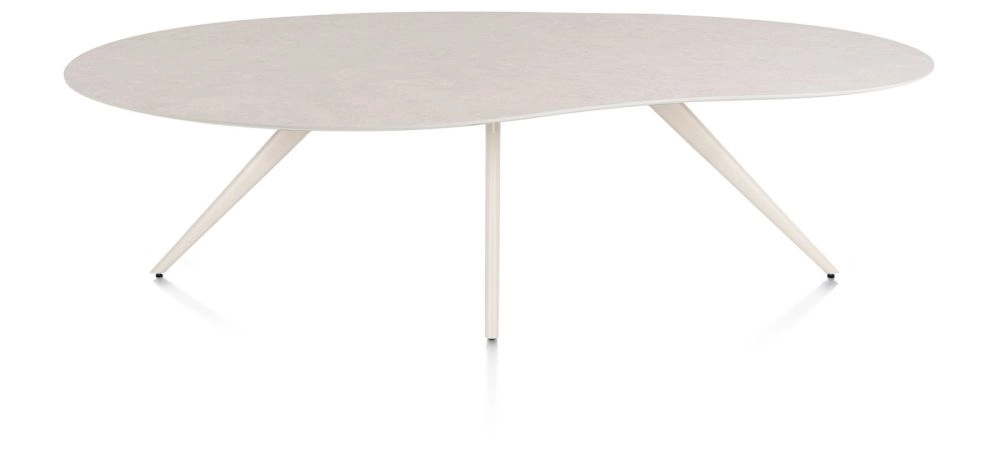 Deze SALUTI eettafel heeft een organisch tafelblad van 240 x 120 cm en staat op een metalen 4-poot onderstel in de kleur crème. Het tafelblad is uitgevoerd in de kleur steenlook light sand en gemaakt van hoogwaardig MDF met een Primo Laminato (HPL) afwerking. Dit materiaal is krasvast, bestand tegen hoge temperaturen en eenvoudig te onderhouden. De asymmetrische vorm doorbreekt rechte lijnen in je interieur en geeft de tafel een eigen karakter.