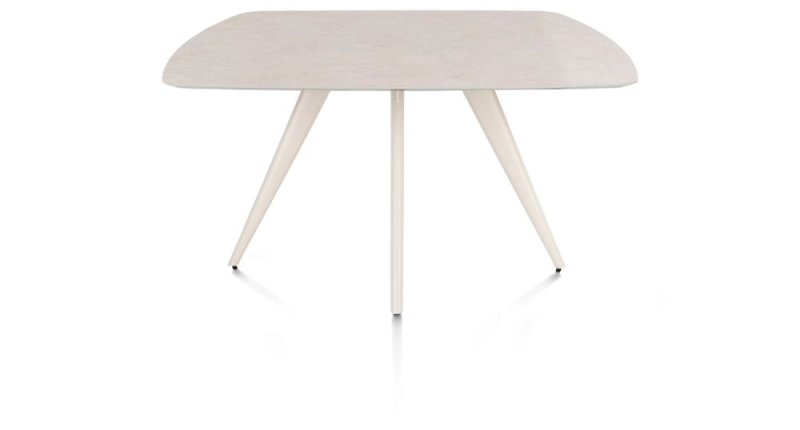 Deze SALUTI eettafel heeft een ovaal tafelblad van 150 x 105 cm en staat op een metalen 4-poot onderstel in de kleur crème. Het blad is afgewerkt in de kleur steenlook light sand en gemaakt van hoogwaardig MDF met een Primo Laminato (HPL) afwerking. Dit materiaal is krasvast, bestand tegen hoge temperaturen en eenvoudig te onderhouden. Dankzij de ovale vorm is de tafel praktisch in gebruik en schuif je prettig aan.