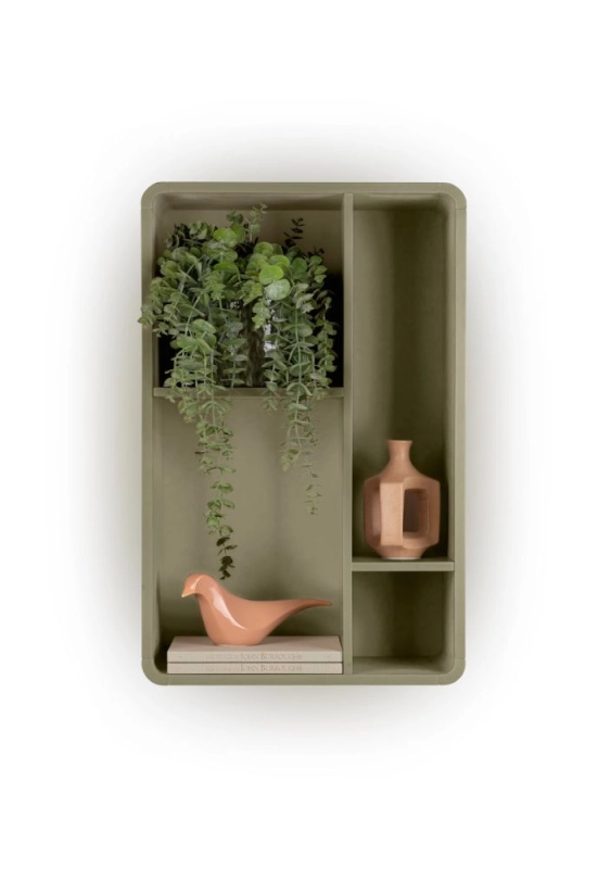 Dit wandelement uit de TRENTINO collectie biedt een praktische manier om spullen een plek aan de wand te geven. De vier open vakken in verschillende groottes zijn geschikt voor accessoires, boeken of decoratie. Het element kan zowel horizontaal als verticaal worden gemonteerd, waardoor je eenvoudig speelt met de indeling. Door de strakke vormgeving past het wandelement goed bij een kastmeubel uit de TRENTINO collectie, maar het laat zich ook los combineren met andere meubelen. De afwerking in gelakt MDF in de keur olijfgroen zorgt voor een moderne uitstraling. Ook verkrijgbaar in de kleur crème.