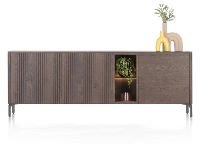 Een eyecatcher voor je interieur, dat is dressoir TRENTON in de kleur clay. TRENTON is vervaardigd van eikenfineer en pronkt op een onderstel van metaal in de kleur grafiet. De afgeronde hoeken doorbreken de strakke lijnen in je interieur. De deuren zijn voorzien van een latjesmotief, wat zorgt voor een speels effect. TRENTON is 211 cm breed en is voorzien van 2-deuren + 3-laden + 2-niches. Hij heeft een handig push to open systeem en de niches zijn voorzien van ledverlichting!