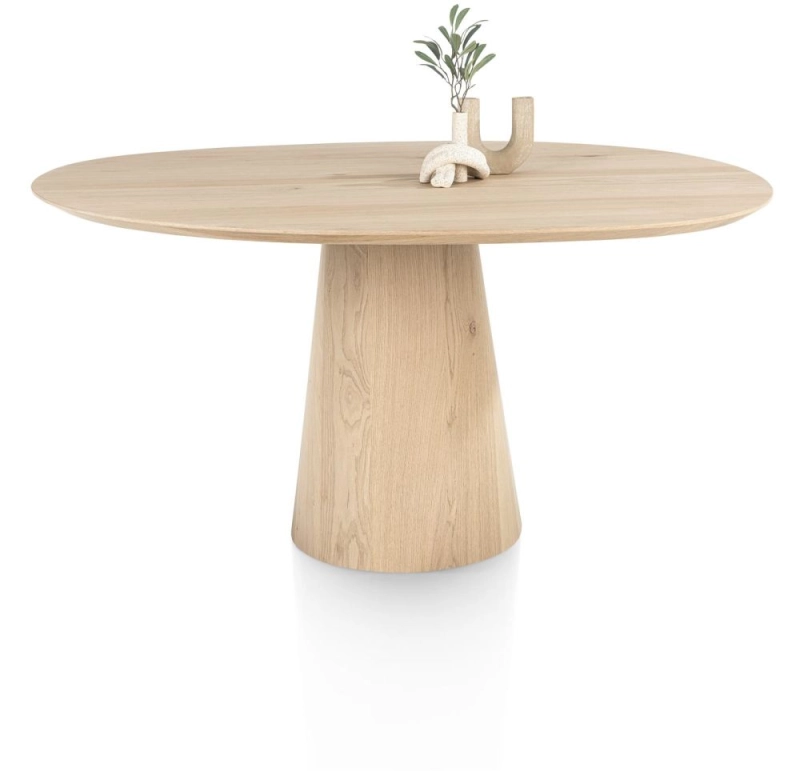TRENTON is een prachtige eetkamertafel met een organisch gevormd blad in de kleur naturel. De eetkamertafel is vervaardigd van eikenfineer en pronkt op een centrale conische poot. De poot is aan de binnenzijde verzwaard om maximale stabilteit van de tafel te garanderen. Het tafelblad heeft een afmeting van 150 x 120 cm en is ook verkrijgbaar in de kleur clay. Laat je ook verrassen door de salontafels en kasten uit de TRENTON serie!