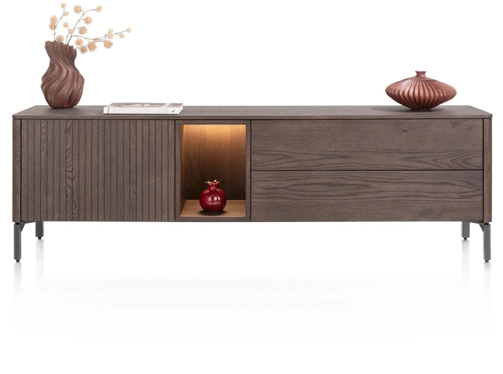Dit is TRENTON, een lowboard met 1-deur + 2-laden + 1-niche dat met led is verlicht. Het lowboard is vervaardigd van eikenfineer in de kleur clay. TRENTON staat bekend om zijn organische design en het unieke latjesmotief in de deuren. De ronde vormgeving loopt aan de voorzijde door in metalen grafietkleurige poten. De deuren en laden van TRENTON hebben een praktisch push to open systeem. Naar wens is dit lowboard ook te plaatsen met plint i.p.v. metalen poten; deze wordt standaard meegeleverd. Ook wandmontage is mogelijk. Voor een natuurlijk effect in je interieur is TRENTON ook verkrijgbaar in de kleur naturel.