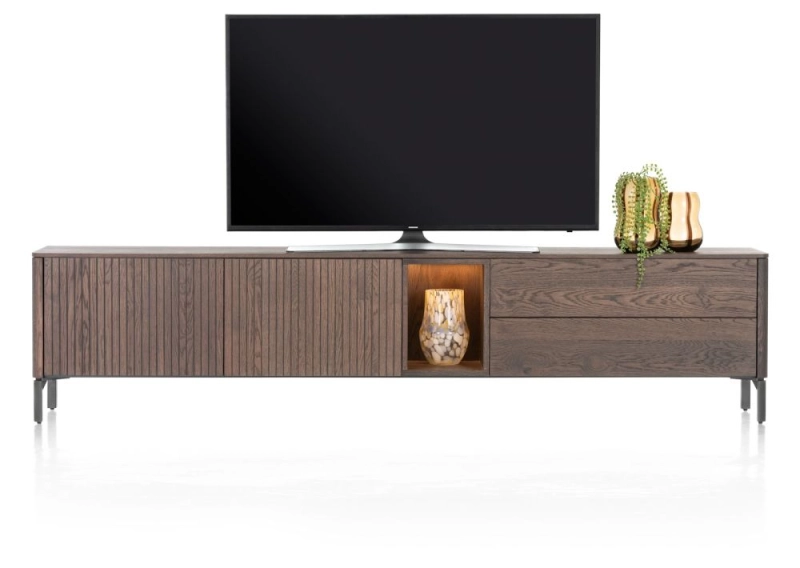 Met lowboard TRENTON in de kleur clay haal je niet alleen extra opbergruimte in huis, maar ook een stijlvolle eyecatcher voor je interieur! Dit lowboard gemaakt van eikenfineer is geliefd vanwege zijn afgeronde hoeken. Het latjesmotief op de deuren geeft TRENTON net wat extra’s. Dit lowboard is maar liefst 240 cm breed en heeft een onderstel van grafietkleurig metaal. De 2-deuren + 2-laden hebben een praktisch push to open systeem en het niche is verlicht met led. Ook te plaatsen met plint i.p.v metalen poten (plint standaard meegeleverd) en ook wandmontage is mogelijk.