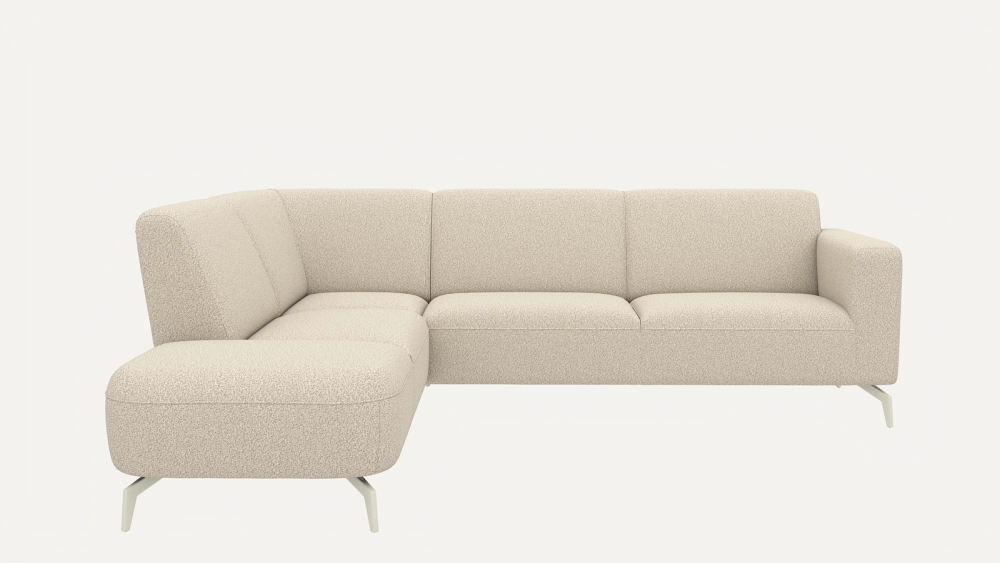 Wil je stijl en comfort combineren in je zithoek? Dan is deze TWIST-opstelling in Brioni kiezel iets voor jou. Deze ruime hoekopstelling bestaat uit een ottomane big links (ligelement) en een 2,5-zits met arm rechts. De afgeronde vormen en zachte boucléstof zorgen voor een gezellige, moderne uitstraling. De standaard pocketvering geeft de bank goed zitcomfort en de elegante metalen poten in silk grey zorgen voor de finishing touch.